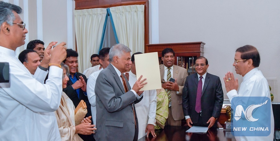 COLOMBO, Dec. 16 (Xinhua) -- Leader of Sri Lanka's United National Party (UNP) Ranil Wickremesinghe, who was once sacked from the post of prime minister in late October, was sworn in as the prime minister by President Maithripala Sirisena again on Sunday, ending a nearly two-month political crisis which erupted after his surprising dismissal.