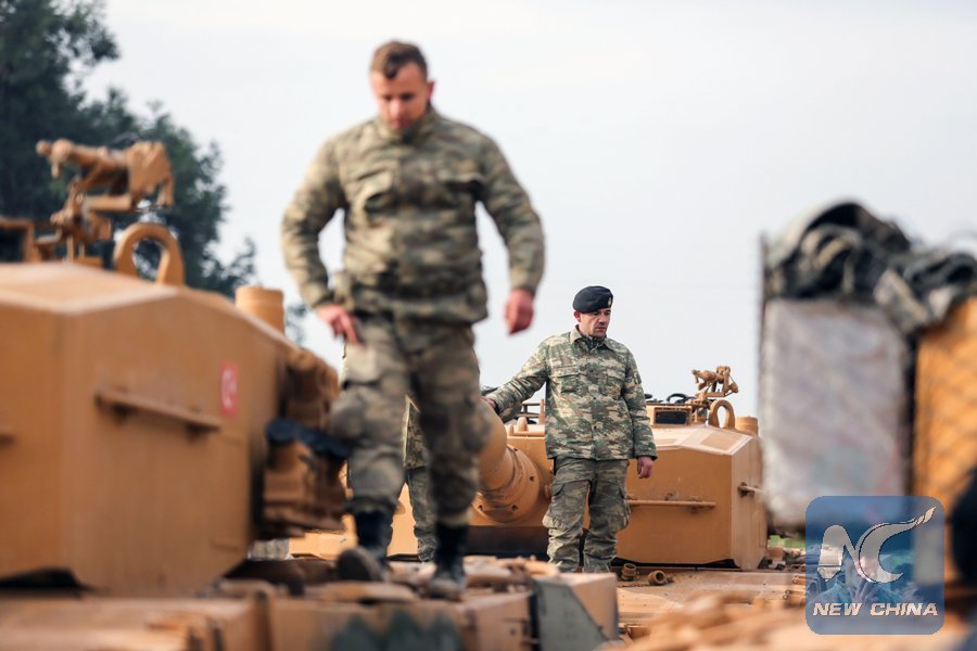 Turkish soldiers prepare their armored vehicles near the Syrian-Turkish border at Reyhanli district in Hatay, Turkey, on Jan. 21, 2018. Turkish ground troops entered Syria's Afrin Sunday on the second day of an offensive against U.S-backed Kurdish militia which should be wrapped up soon, said Turkish President Recep Tayyip Erdogan. (Xinhua Photo)
