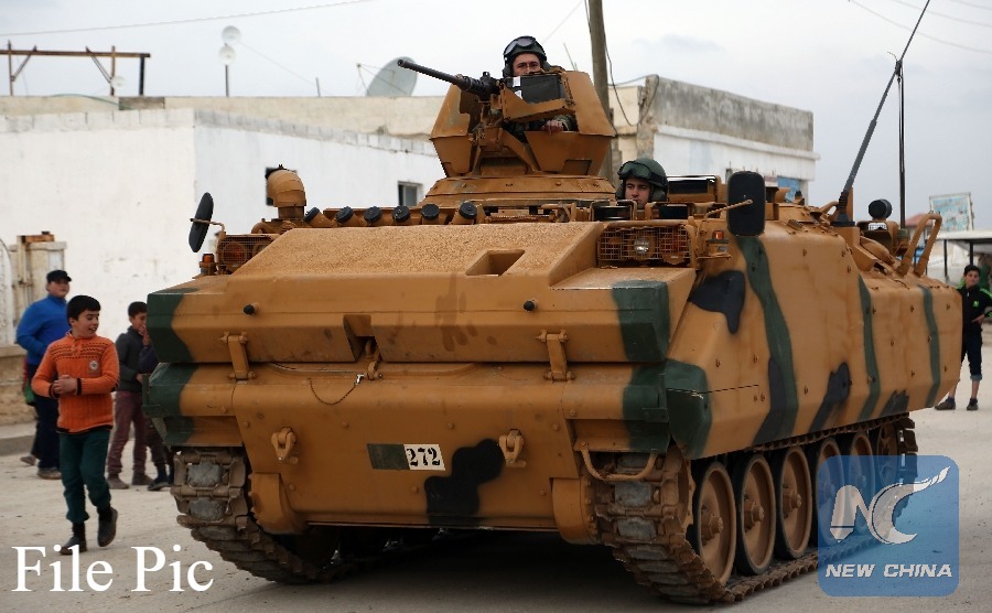Turkish soldiers look through the hatches and turrets of an infantry fighting vehicle (IFV) as they pass through the Bab al-Salamah border crossing between Syria and Turkey in the north of Aleppo Province, on Jan. 21, 2018. (AFP File photo)