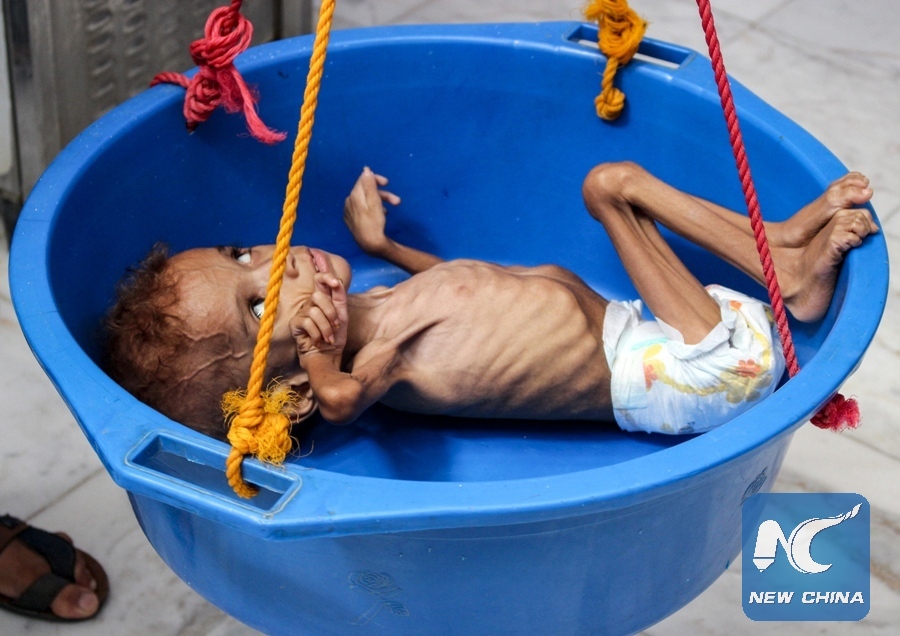 Bassem Mohamed Hassan, a two-year-old Yemeni boy suffering from malnutrition, has his weight measured at a hospital in the northern district of Abs in the northwestern Hajjah province on Sept. 19, 2018. (AFP/Xinhua)