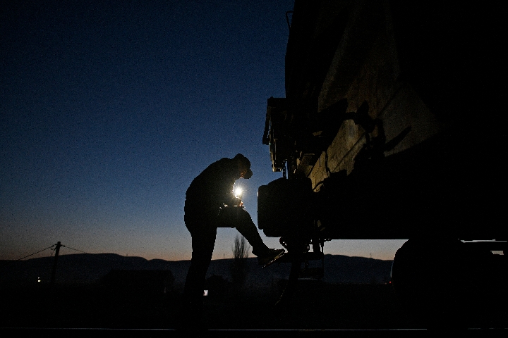 Railway policeman Gou Fawei checks a train when he patrols the railway line crossing Haiyuan County and its neighboring Tongxin County in northwest China's Ningxia Hui Autonomous Region, Jan. 23, 2019. (Xinhua/Wang Peng)