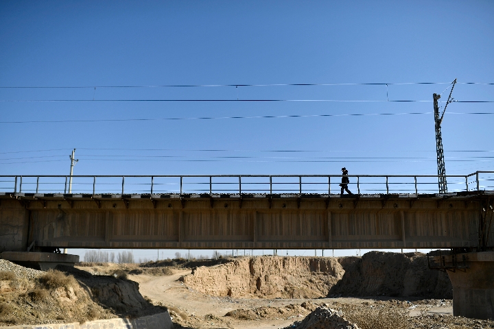 Railway policeman Gou Fawei patrols the railway line crossing Haiyuan County and its neighboring Tongxin County in northwest China's Ningxia Hui Autonomous Region, Jan. 23, 2019. (Xinhua/Wang Peng)