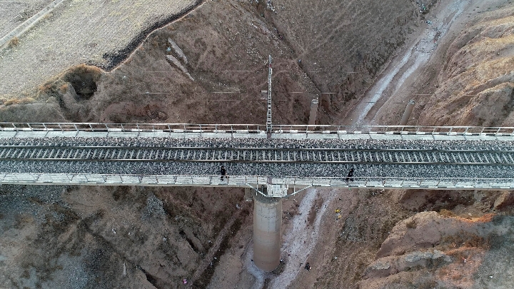 Railway policeman Gou Fawei (L) and his wife, policewoman Luo Yakun, meet on a railway bridge on the junction of the administrative areas by their two police stations when patrolling the railway line crossing Haiyuan County and its neighboring Tongxin County in northwest China's Ningxia Hui Autonomous Region, Jan. 23, 2019. (Xinhua/Wang Peng)