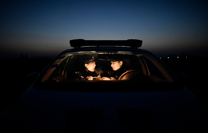 Railway policeman Gou Fawei (R) and his wife, policewoman Luo Yakun, have dumplings in a patrol car during a short break when patrolling the railway line crossing Haiyuan County and its neighboring Tongxin County in northwest China's Ningxia Hui Autonomous Region, Jan. 23, 2019. (Xinhua/Wang Peng)