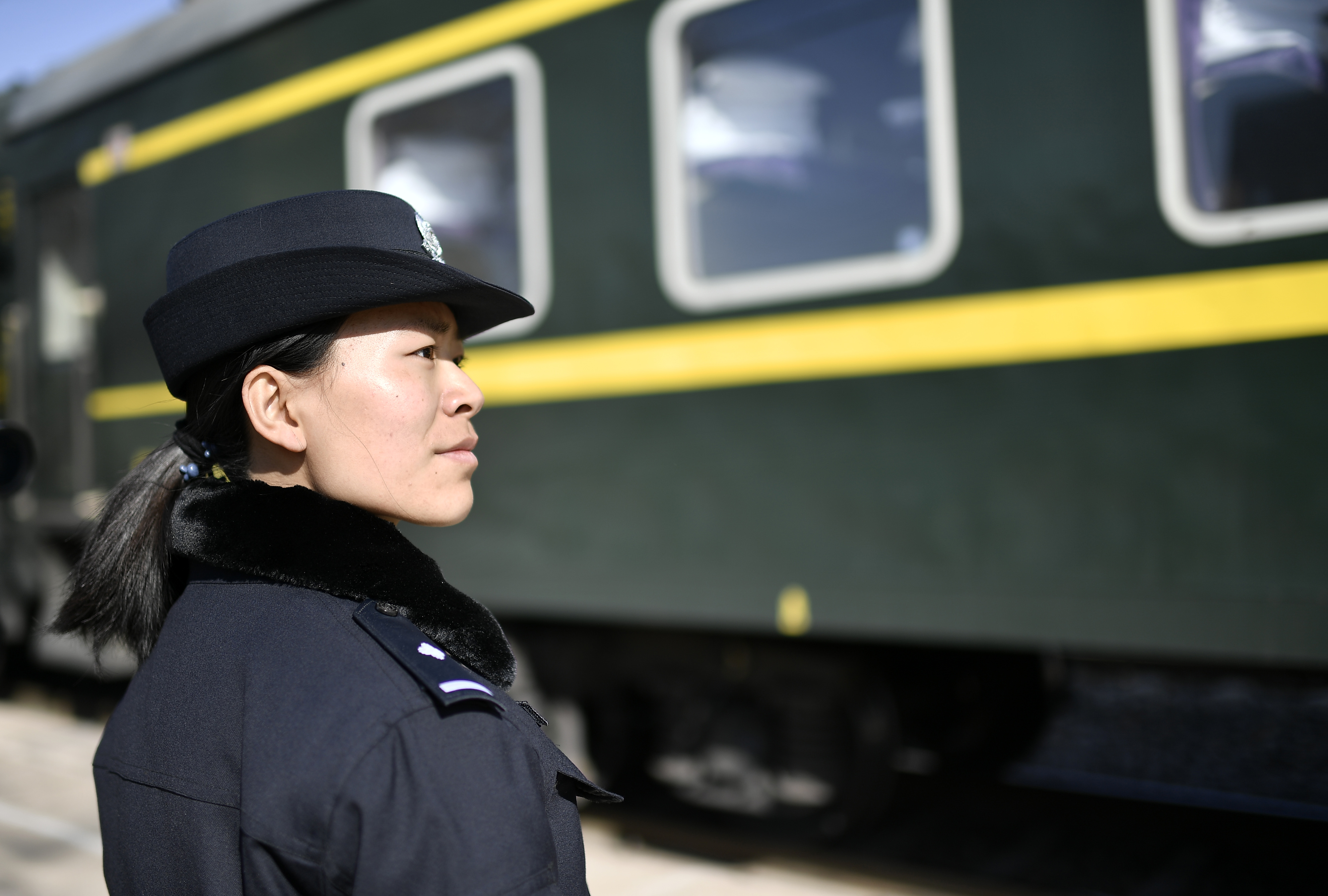 Railway policewoman Luo Yakun stands guard next to a passing train when patrolling the railway line crossing Haiyuan County and its neighboring Tongxin County in northwest China's Ningxia Hui Autonomous Region, Jan. 23, 2019. (Xinhua/Wang Peng)