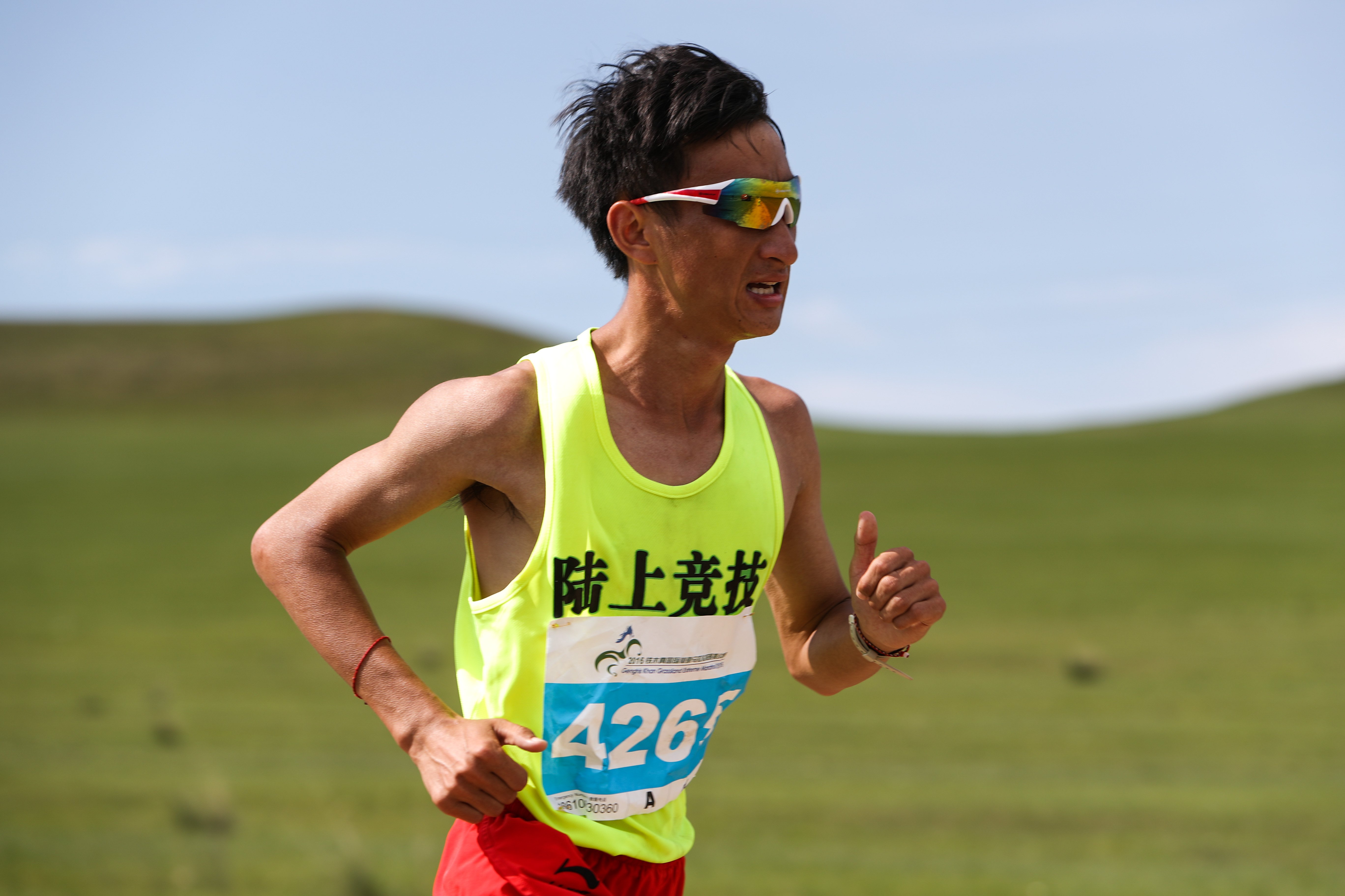 Pan Lihui of China runs during the men's full marathon competition of the 9th Grassland Extreme Marathon in West Ujimqin Banner in north China's Inner Mongolia Autonomous Region, July 2, 2016. (Xinhua/Zheng Huansong)