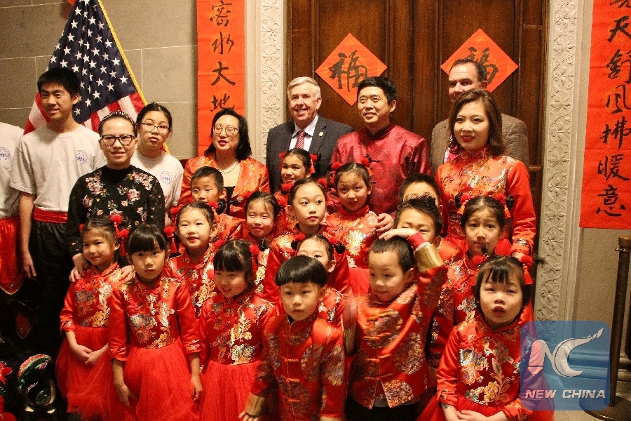 Missouri Governor Mike Parson (back, C) poses for photos with teachers and students from Columbia Chinese Language School in front of his office door with Chinese New Year decorations, in Jefferson City, Missouri, the United States, on Feb. 4, 2019. (Xinhua/Heng Xiao)