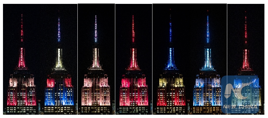 Combo photo shows the top of the landmark Empire State Building being lit in special designed lights for Chinese Lunar New Year in New York, the United States, Feb. 4, 2019. (Xinhua/Wang Ying)