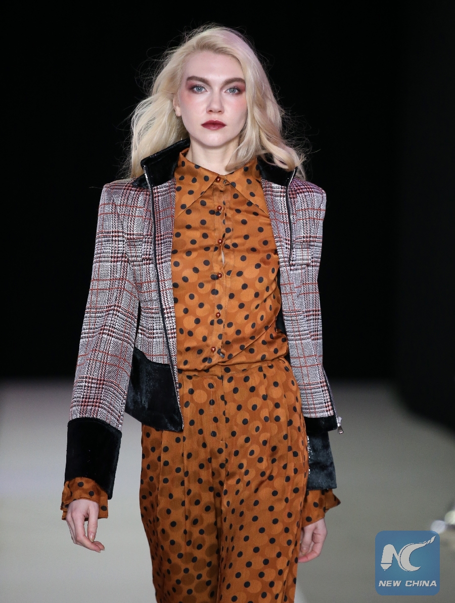 A model presents a creation from the Vivienne Hu Fall/Winter 2019 collection during the New York Fashion Week in New York, the United States, Feb. 13, 2019. (Xinhua/Qin Lang)