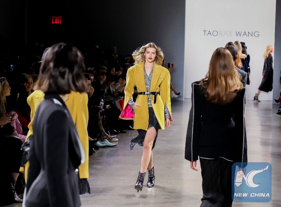 Models present creations of the Taoray Wang Fall/Winter 2019 collection during the New York Fashion Week in New York, the United States, on Feb. 9, 2019. (Xinhua/Wang Ying)