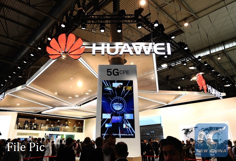 Photo taken on Feb. 26, 2018 shows a screen displaying the 5G technology at the booth of China's telecom giant Huawei during the 2018 Mobile World Congress (MWC) in Barcelona, Spain. (Xinhua/Guo Qiuda)