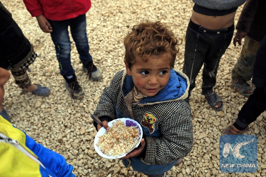 File Photo: A displaced Syrian child eats a bowl of rice at a refugee camp in Syria's northeastern Hassakeh province on Feb. 26, 2018. (Xinhua/AFP)