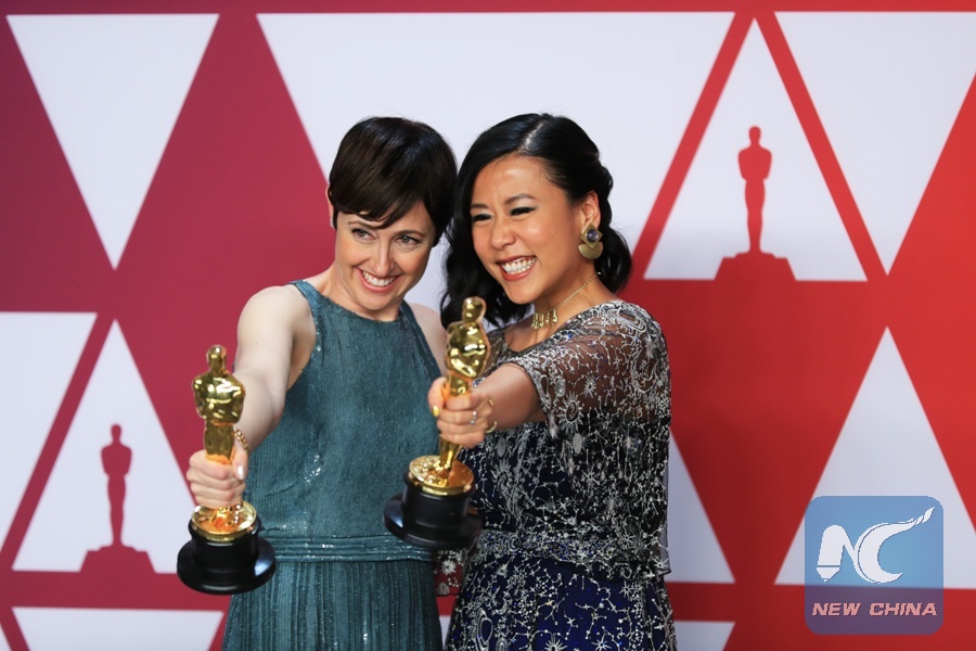 Becky Neiman-Cobb (L) and Domee Shi pose for photos after winning the Best Animated Short Film award for "Bao" in the press room during the 91st Academy Awards ceremony, or the Oscars, held at the Dolby Theatre in Los Angeles, the United States, on Feb. 24, 2019. (Xinhua/Li Ying)