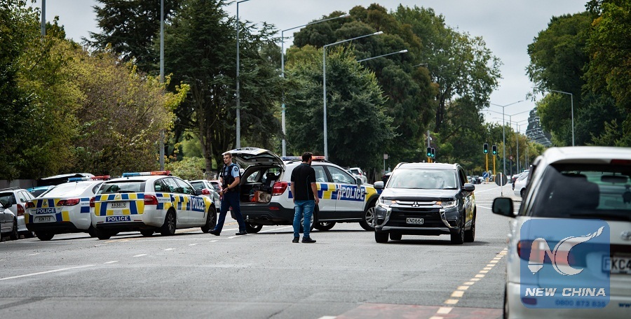 Gunmen stormed a mosque in Christchurch in New Zealand and armed police have been deployed. Major intersections are blocked, March 15, 2019. (Xinhua/Zhu Qiping)