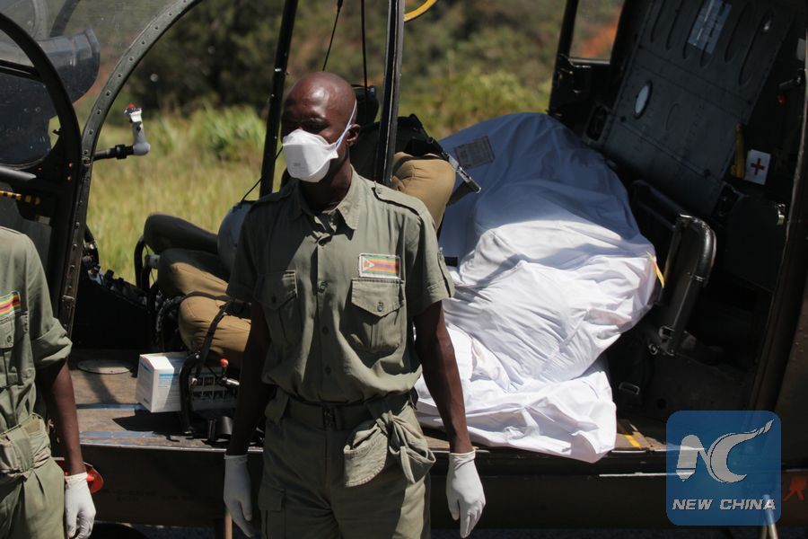 The body of a victim is being transferred by a military helicopter in Chimanimani, Manicaland Province, Zimbabwe, March 21, 2019. (Xinhua/Shaun Jusa)