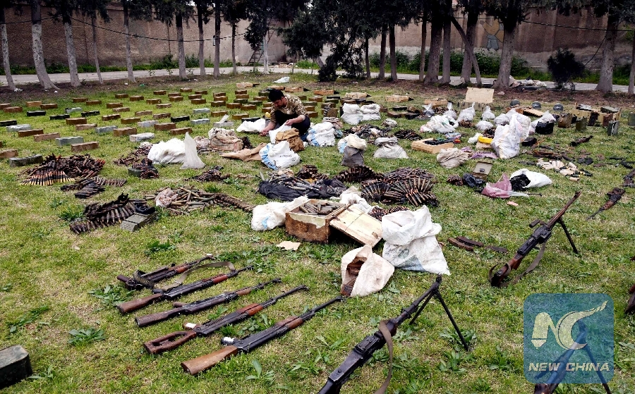 Confiscated weapons are seen at a military base in Damascus, Syria, on March 23, 2019. (Xinhua/Ammar Safarjalani)