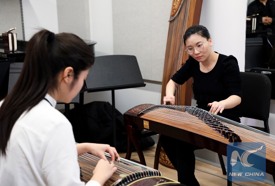 Wang Yixin (R), a first-year student in the double degree program of the Bard College Conservatory of Music (BCOM) and its U.S.-China Music Institute, in partnership with the Central Conservatory of Music (CCOM) in Beijing, practises guzheng, or Chinese zither, in a class at Bard College in Annandale-on-Hudson, New York, the United States, March 12, 2019. (Xinhua/Zou Guangping)