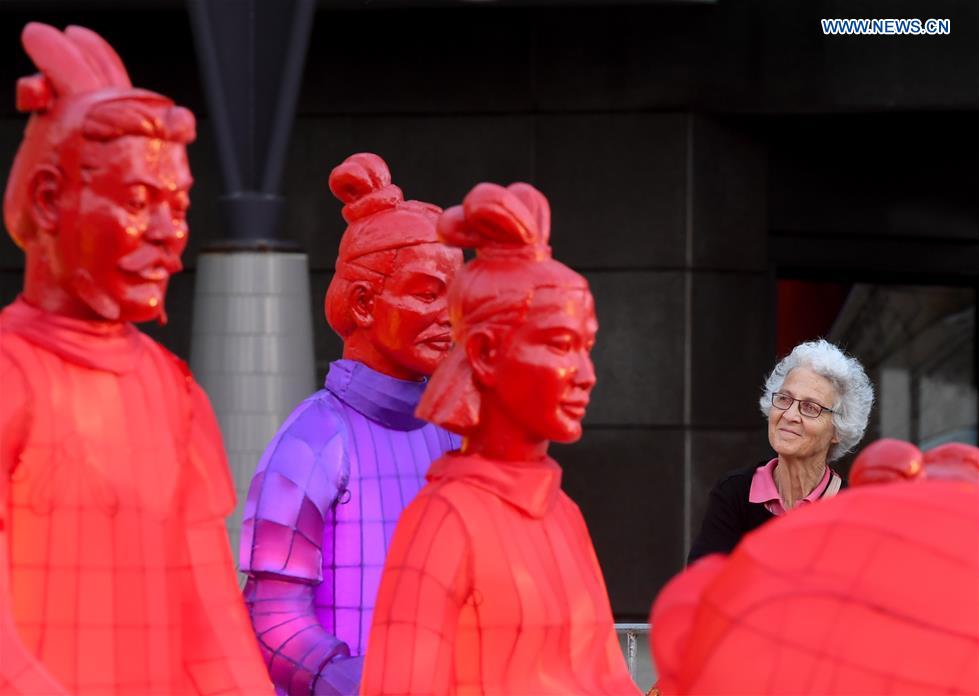 Terracotta Warrior lanterns are on display outside the National Museum of New Zealand to celebrate the Chinese Lunar New Year in Wellington, New Zealand, Feb. 5, 2019. (Xinhua/Guo Lei)