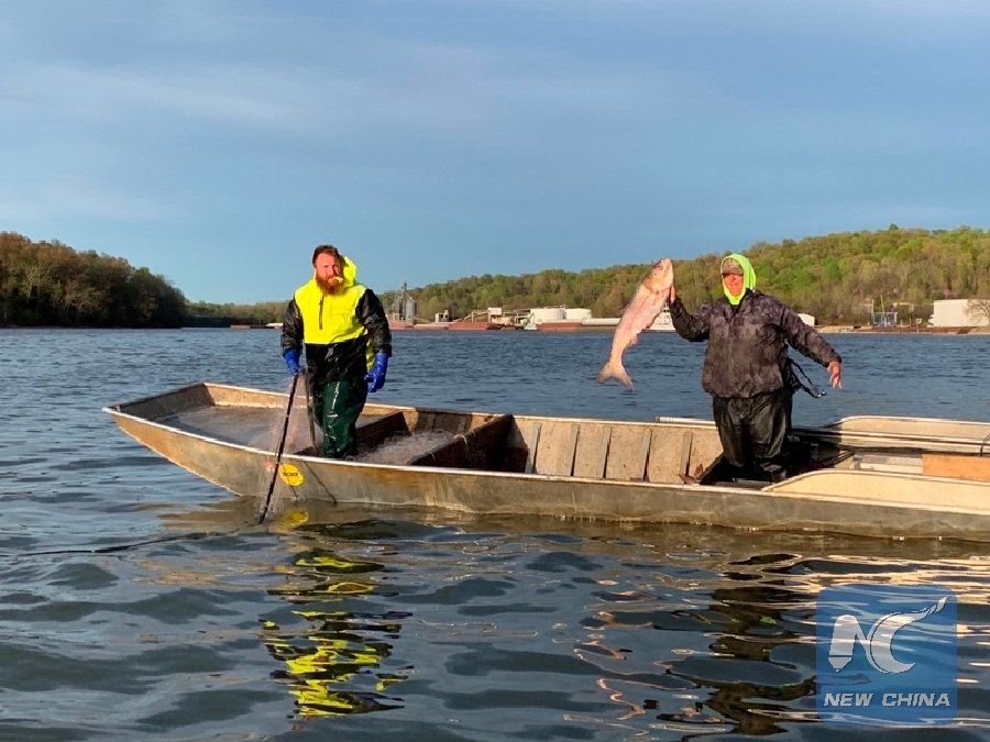 Fishermen are harvesting Asian carp in the water near a fish collection site of Angie Yu, president of the Two Rivers Fisheries in Wickliffe, Ballard County in southeastern U.S. state of Kentucky on April 12, 2019. (Xinhua/Xu Feng)