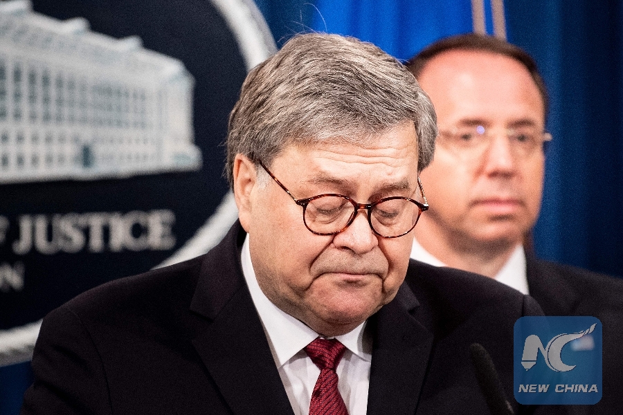 U.S. Deputy Attorney General Rod Rosenstein (R) listens while Attorney General William Barr speaks during a press conference about the release of the Mueller Report at the Department of Justice April 18, 2019, in Washington, D.C. (Xinhua/AFP)