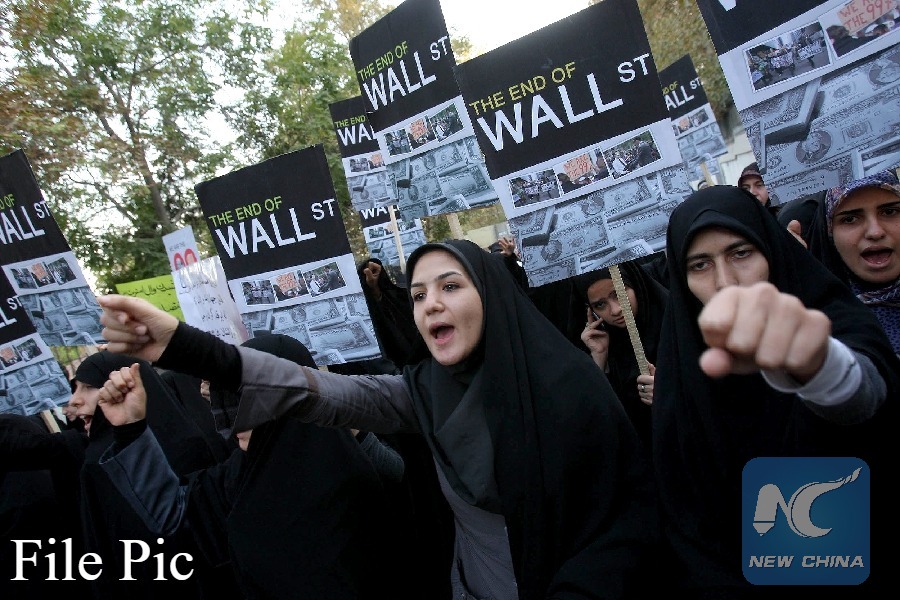 Students shout slogan during a gathering in support of U.S. Wall Street demonstrators outside the Swiss embassy which handles U.S. interests in Tehran, Iran, on Oct. 22, 2011. (Xinhua File photo)