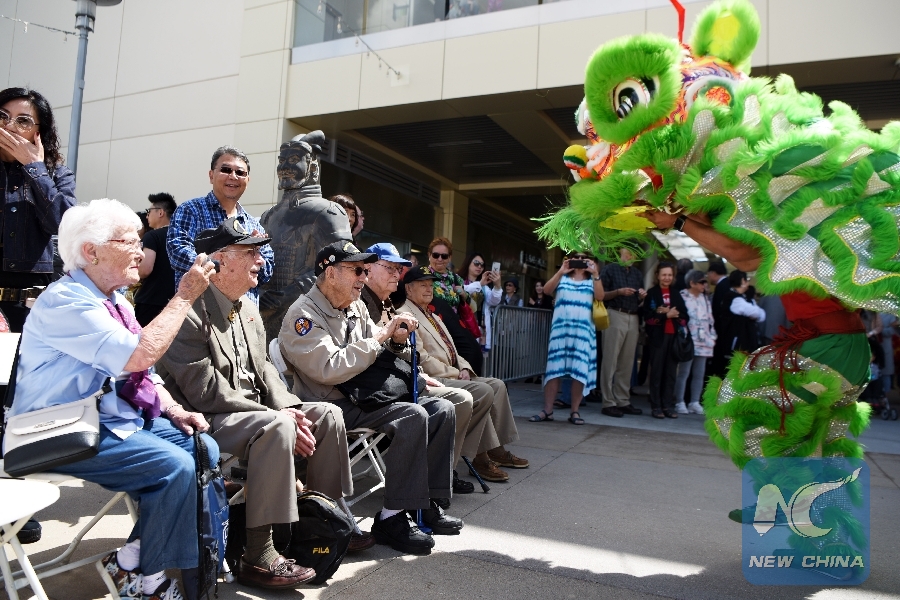 Flying Tigers veterans (front) attend the opening ceremony of the 2019 U.S.-China Cultural Tourism Festival in Las Vegas, the United States, May 10, 2019. (Xinhua/Han Fang)