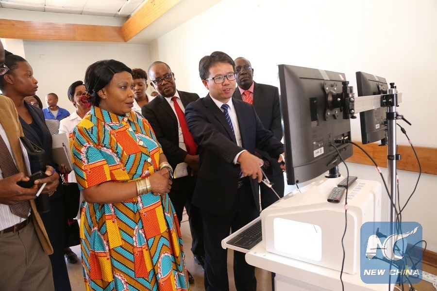 Zimbabwean First Lady Auxillia Mnangagwa (L, front), also the country's ambassador for Health and Child Care, watches the use of a laparoscopic simulator donated by China's Hunan Provincial Maternal Hospital in Parirenyatwa Hospital, Harare, Zimbabwe, May 7, 2019. (Xinhua/Zhang Yuliang)