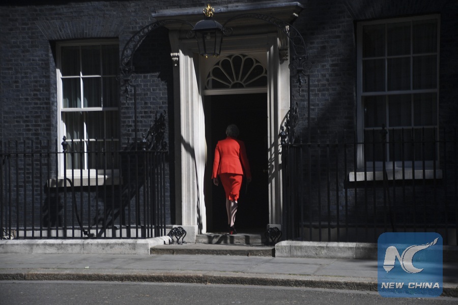 British Prime Minister Theresa May returns after speaking to the media outside 10 Downing Street in London, Britain on May 24, 2019.(Xinhua/Alberto Pezzali)
