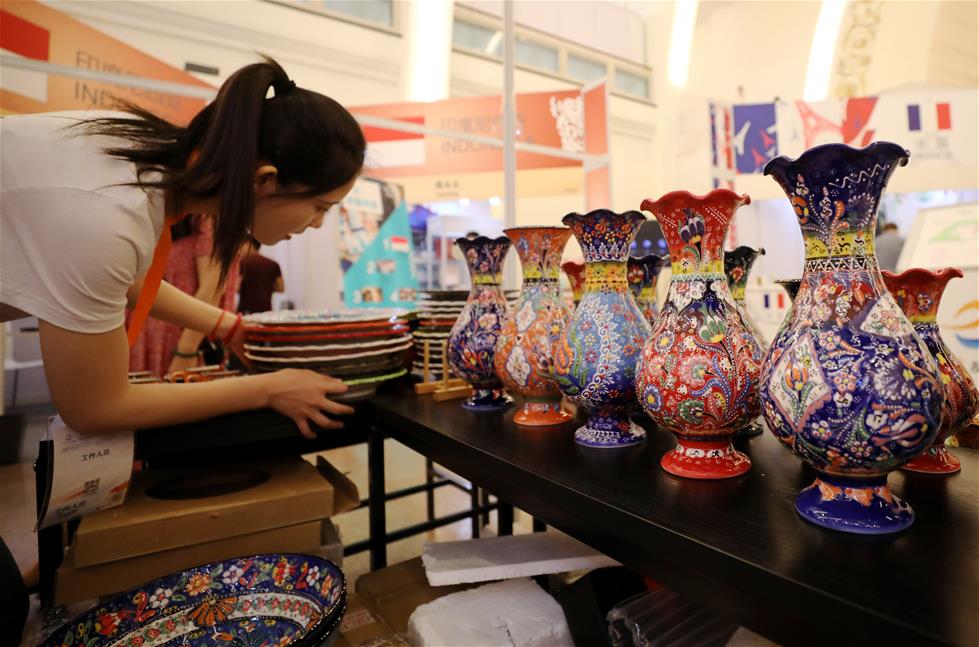 A staff worker arranges exhibites from Turkey in Shanghai, east China, May 31, 2019. The Belt and Road Brand Expo 2019 kicked off at Shanghai Exhibition Center in Shanghai Friday. (Xinhua/Fang Zhe)