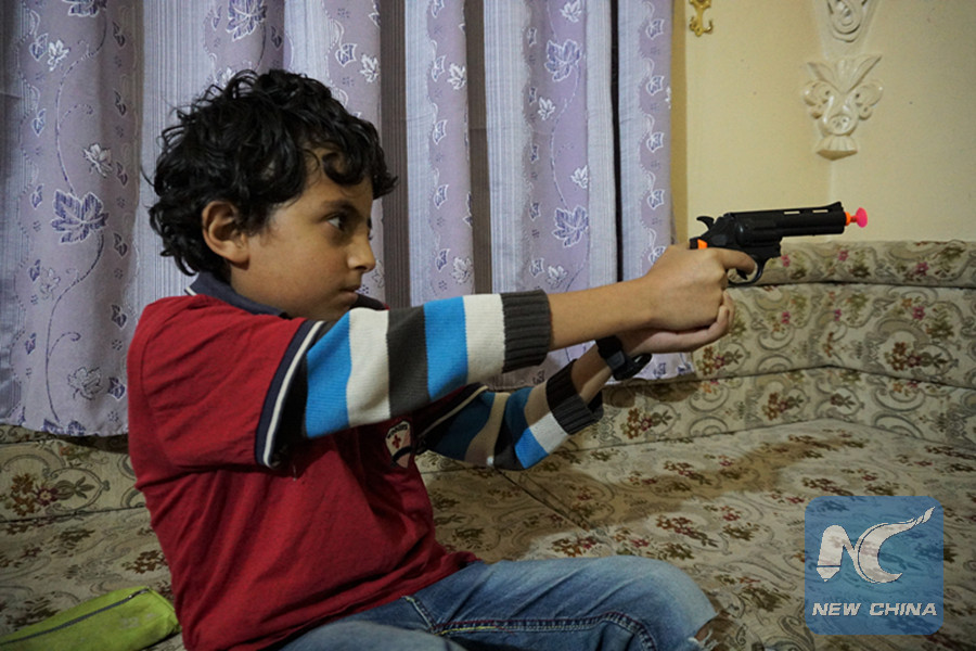 Yahya Motahar's son Osama plays with a toy gun at home in Sanaa, Yemen, on May 25, 2019. (Xinhua/Mohamed al-Azaki)