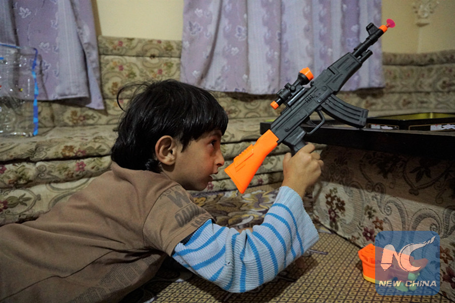 Yahya Motahar's son Rawouf plays with a toy gun at home in Sanaa, Yemen, on May 25, 2019. (Xinhua/Mohamed al-Azaki)