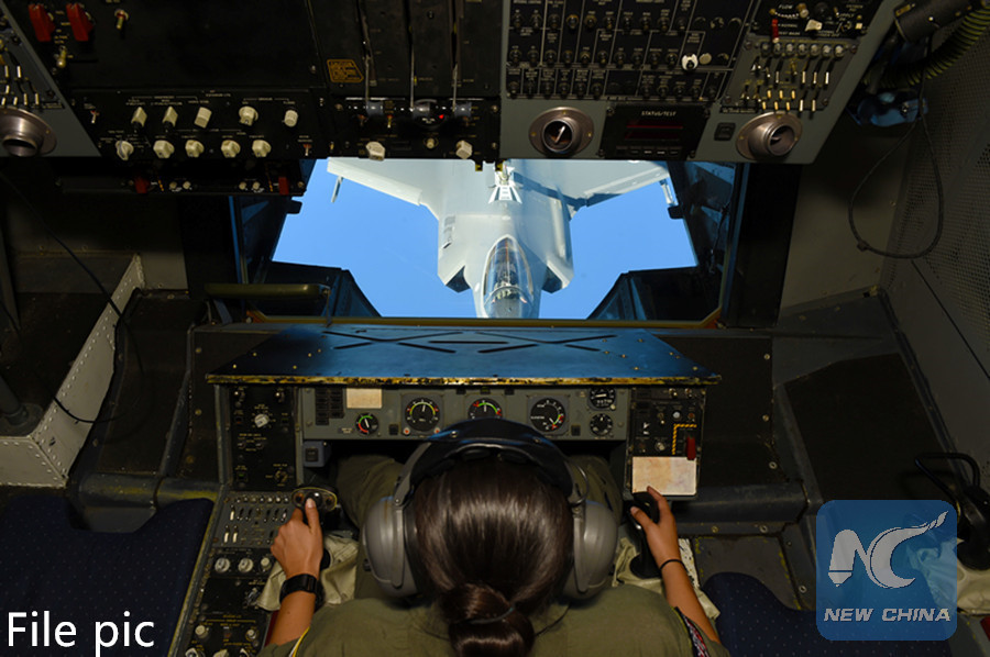 U.S. Air Force TSgt Arriel Bromley operates the fuel injection arm of a KC-10 Extender connected to an F-35Lightning II for a mid-air refueling training mission during exercise Astral Knight 19 over the Adriatic Sea, June 3, 2019. (Reuters photo)