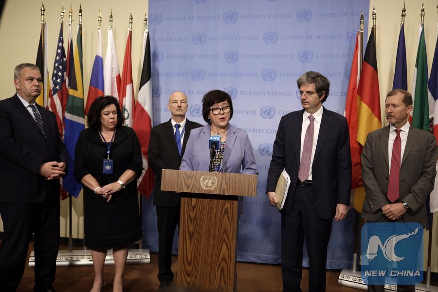 Joanna Wronecka (front), Polish permanent representative to the United Nations, reads out a joint statement of six current and future European Union (EU) members of the UN Security Council (Britain, France, Germany, Belgium, Poland and Estonia) at the UN headquarters in New York, June 26, 2019. (Xinhua/Li Muzi)