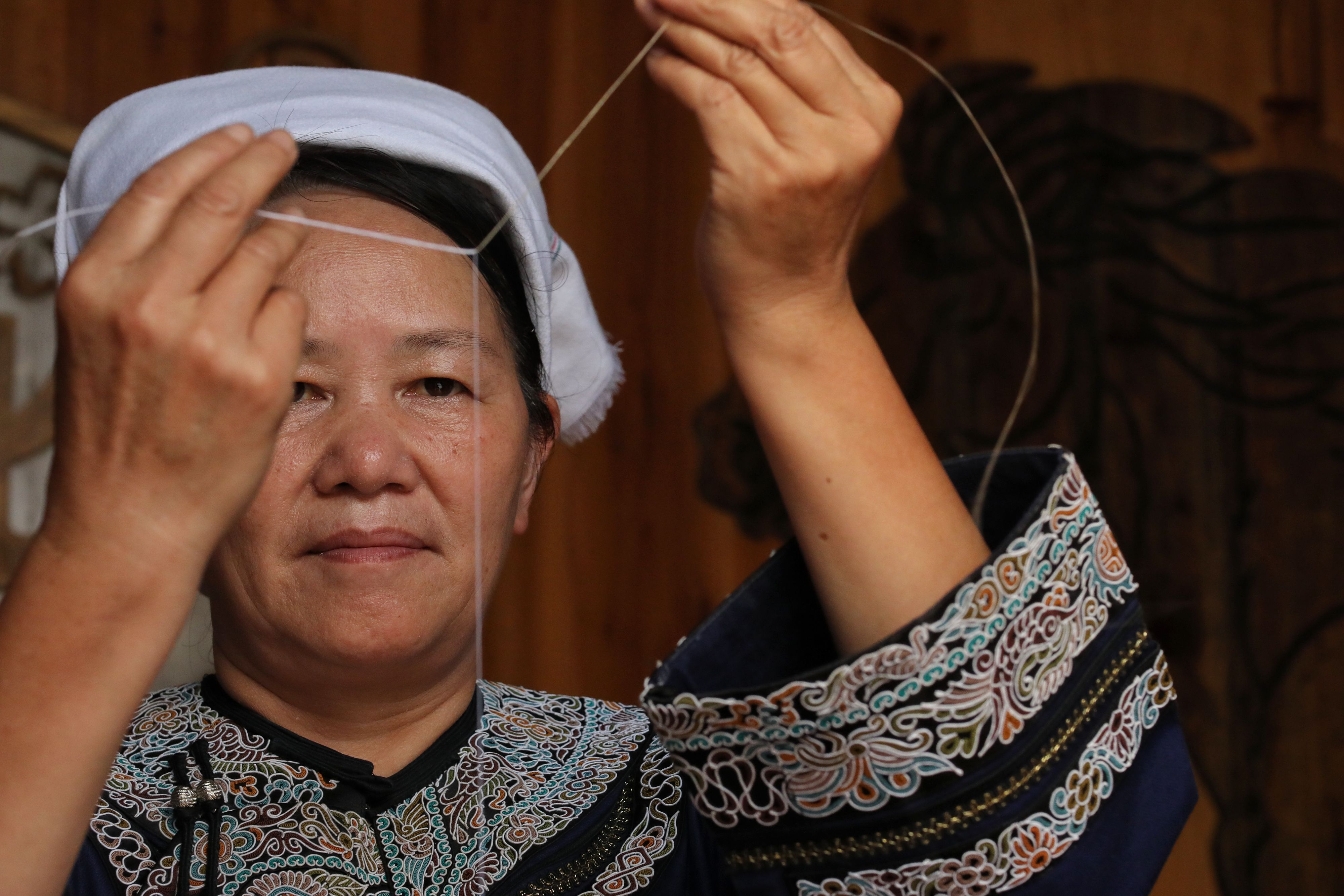 Wei Taohua makes sewing threads for the traditional horse tail embroidery with horse tail fibers and silk yarns. (Xinhua/Ou Dongqu)