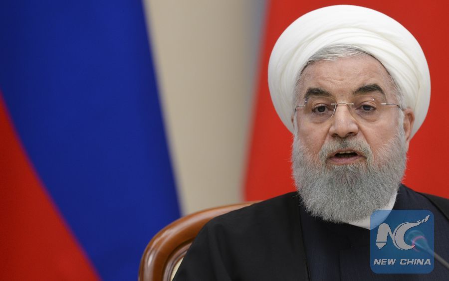Iranian President Hassan Rouhani speaks during a meeting with Russian President Vladimir Putin and Turkish President Recep Tayyip Erdogan in Sochi, Russia, on Feb. 14, 2019. (Xinhua/Sputnik)