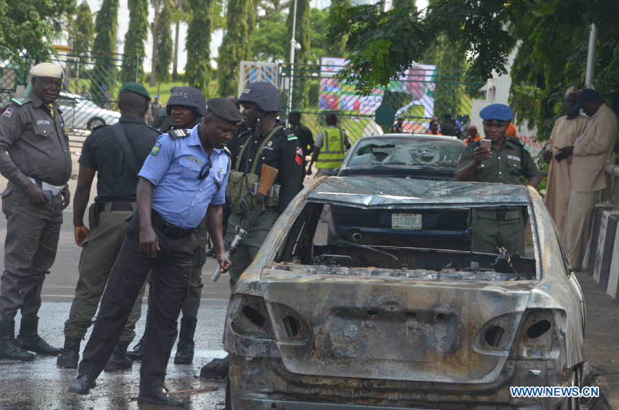 Policemen examine a burned car after a protest in Abuja, Nigeria, on July 9, 2019. Police authorities in Nigeria said 40 protesters were nabbed on Tuesday after an invasion of the national parliament by members of the Islamic Movement, also known as the Shi'ites Movement. A march for the release of the detained leader of the Islamic Movement, Sheikh Ibrahim El-Zakzaky and his wife turned violent when hundreds of protesters invaded the parliament in the capital. (Xinhua/Olatunji Obasa)