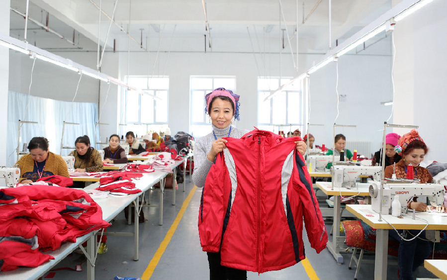 A villager demonstrates a coat at a textile workshop in Gaimai Village of Yining County, northwest China's Xinjiang Uygur Autonomous Region, Nov. 22, 2017. (Xinhua)