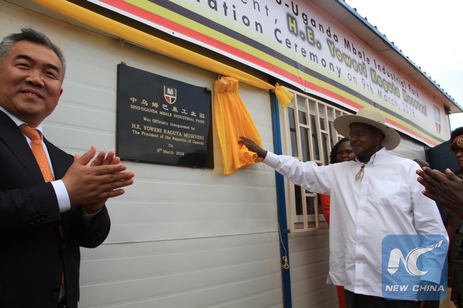 Ugandan President Yoweri Museveni (R) attends the inauguration ceremony of the Mbale Industrial Park in Mbale, Uganda, March 9, 2018. TO GO with Xinhua Headlines: Chinese support propelling Africa's solid progress toward industrialization. (Xinhua/Zhang Gaiping)