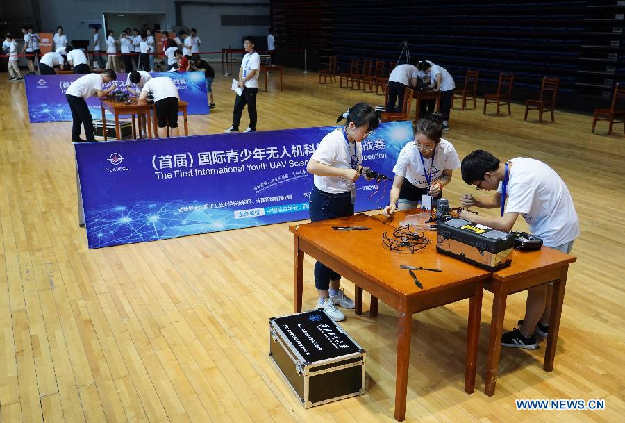 Contestants assemble unmanned aerial vehicles (UAV) during the first International Youth UAV Science Camp & Competition (IYUAVSCC) in Xi'an, northwest China's Shaanxi Province, July 21, 2019. The first IYUAVSCC, launched by Chinese Society of Aeronautics and Astronautics (CSAA) and Northwestern Polytechnical University, kicked off here on Monday, attracting high school students from home and abroad. (Xinhua/Shao Rui)