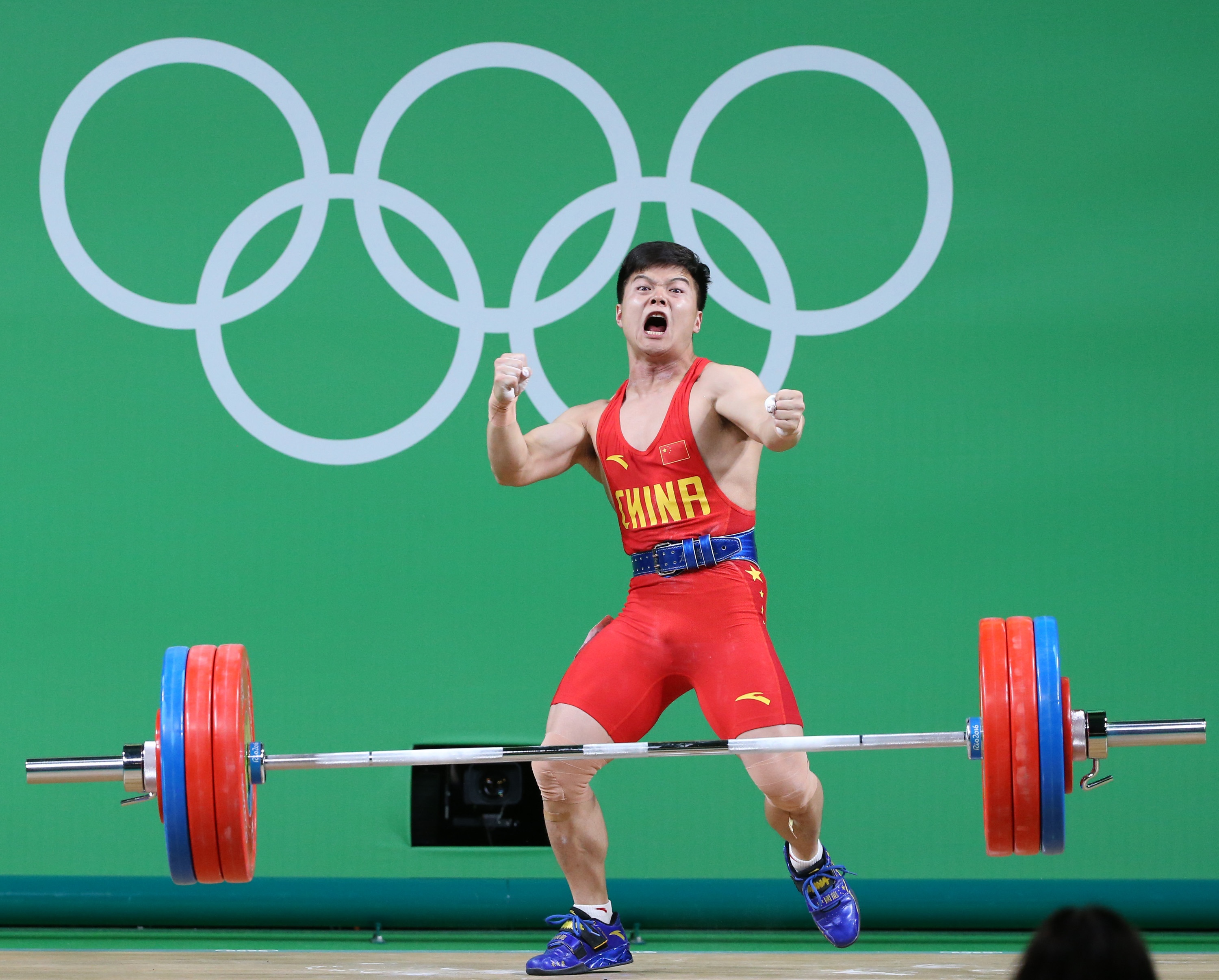 Long Qingquan of China celebrates after the men's 56KG weightlifting final in Rio de Janeiro, Brazil, on Aug. 7, 2016. (Xinhua/Li Ming)
