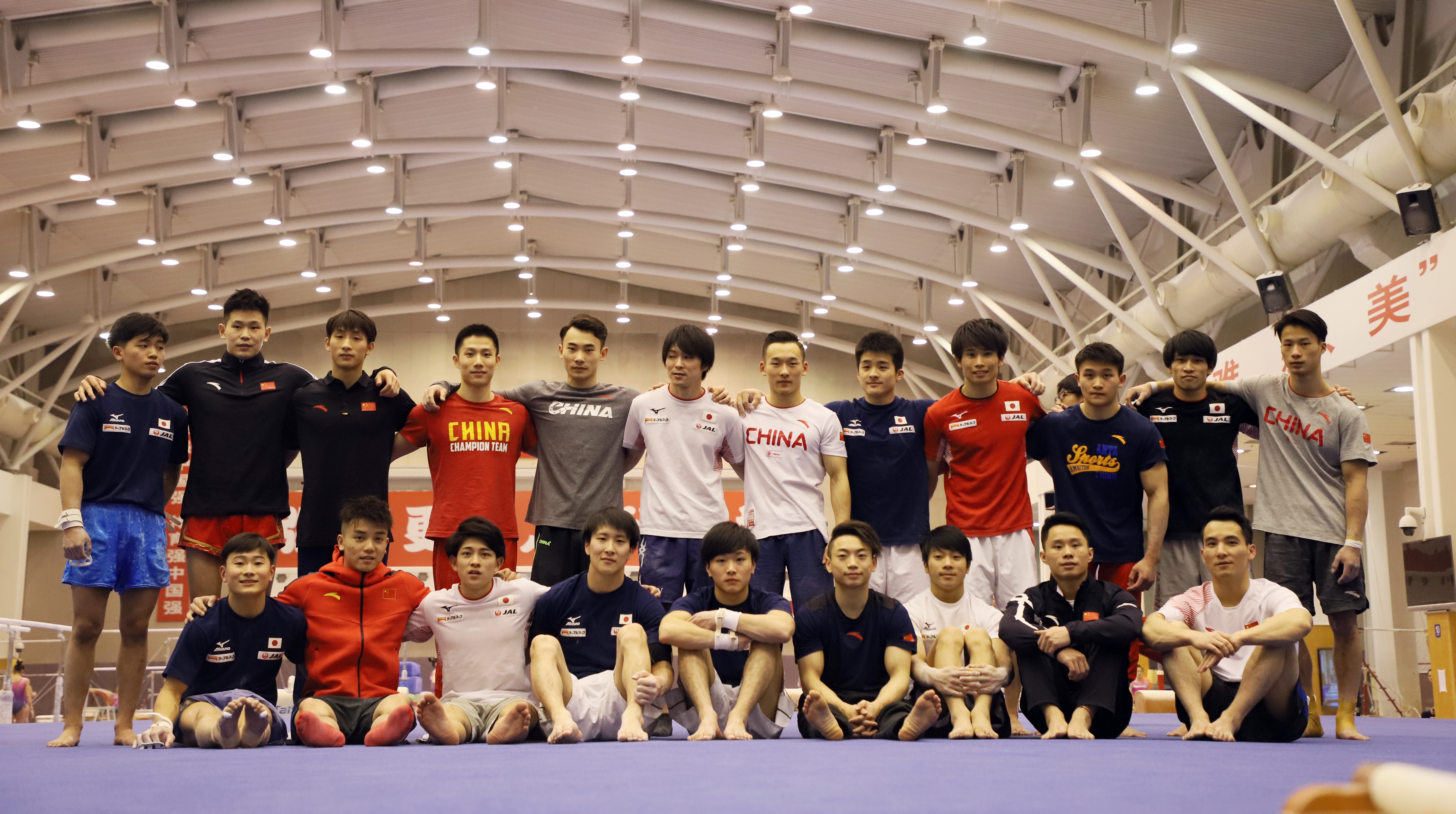 Members of Chinese and Japanese men's gymnastics teams pose for a group photo after a training in Beijing, capital of China, on Jan. 30, 2019. (Xinhua/Luo Yuan)