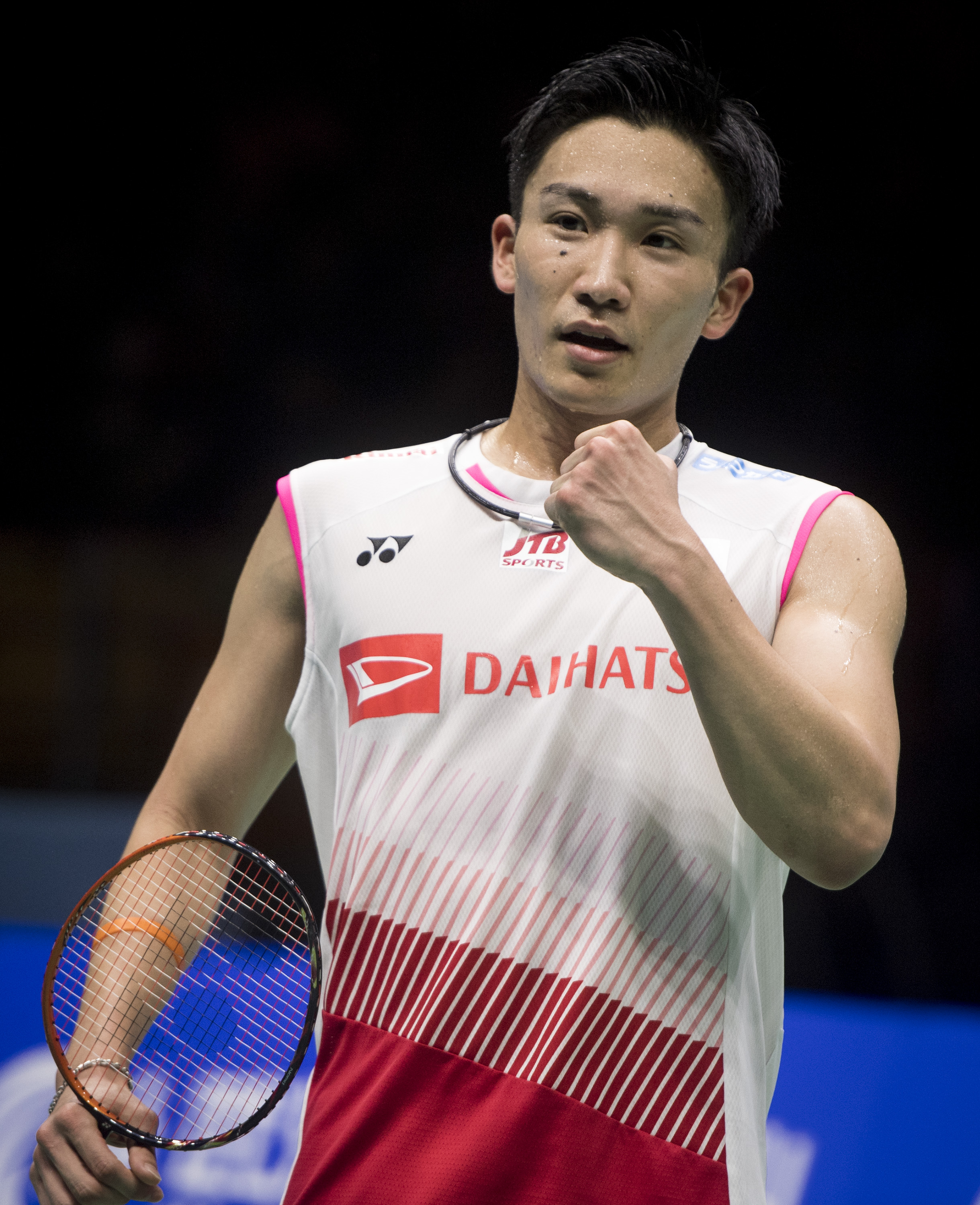 Momota Kento of Japan celebrates during the men's singles final match between Momota Kento of Japan and Shi Yuqi of China at the BWF Badminton Asia Championships 2019 in Wuhan, capital of central China's Hubei Province, on April 28, 2019. (Xinhua/Xiao Yijiu)