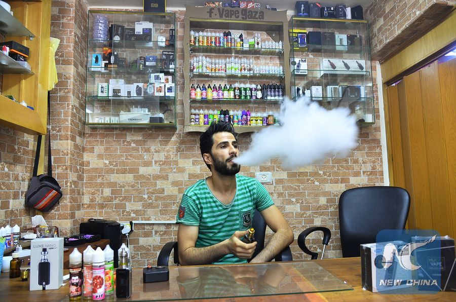 A Palestinian vendor exhales while using Vape device inside his shop, in Gaza City, July 21, 2019. (Xinhua/Stringer)