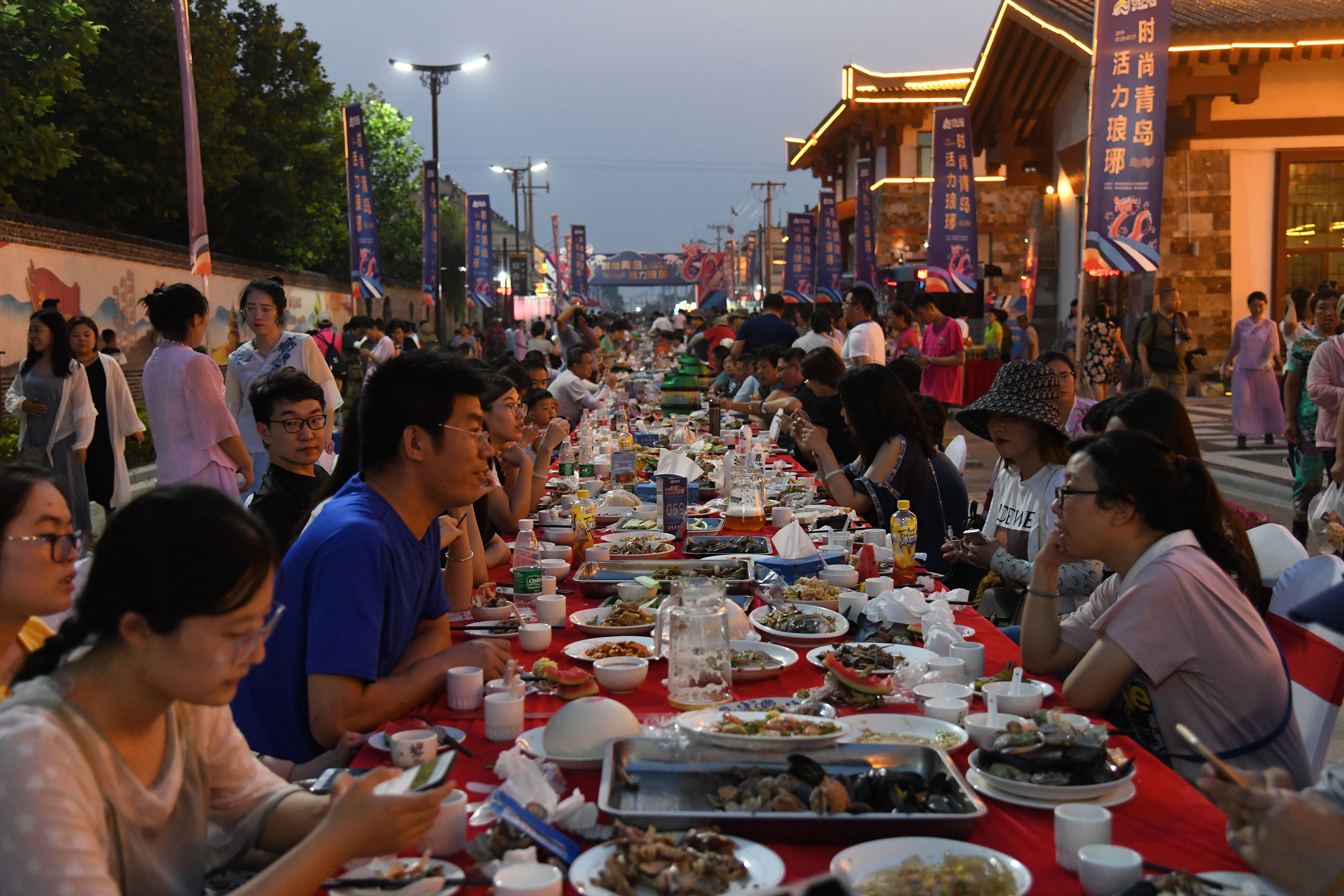 Photo taken on July 20, 2019 shows tourists enjoy fresh seafood at night in Qingdao, east China's Shandong province. (Xinhua/Zhang Shanchen)