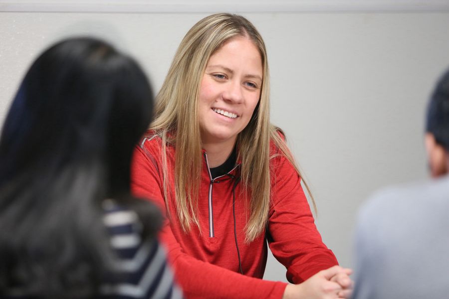 Jess Bailey (C), direct materials purchasing manager at Safelite Group, speaks in an interview with Xinhua in Dayton of Ohio, the United States, on July 26, 2019. (Xinhua/Zhang Fengguo)