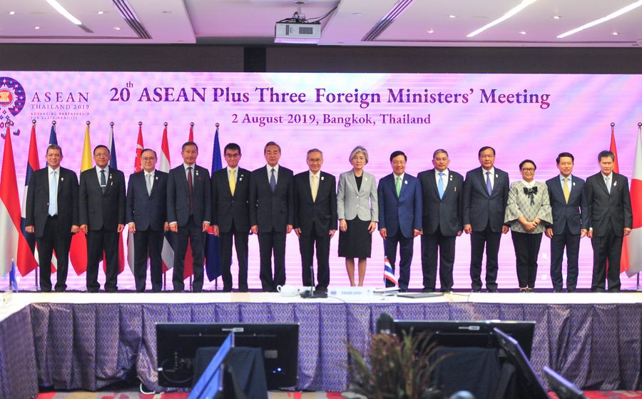 Chinese State Councilor and Foreign Minister Wang Yi (6th L) attends the 20th ASEAN (the Association of Southeast Asian Nations) Plus Three Foreign Ministers' Meeting in Bangkok, Thailand, Aug. 2, 2019. (Xinhua/Rachen Sageamsak)