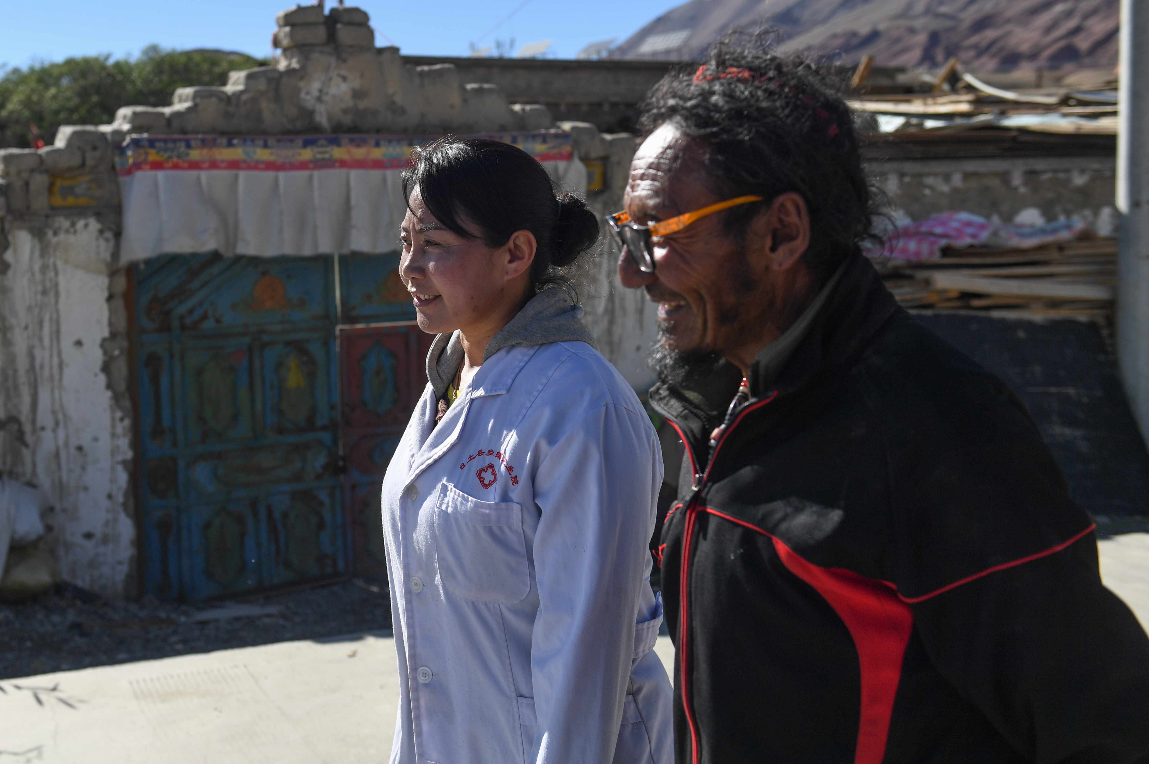 Zhoima (R) makes a home visit in Wuqang Village, SW China's Tibet Autonomous Region, Aug. 3, 2019. (Xinhua/Jigme Dorje)