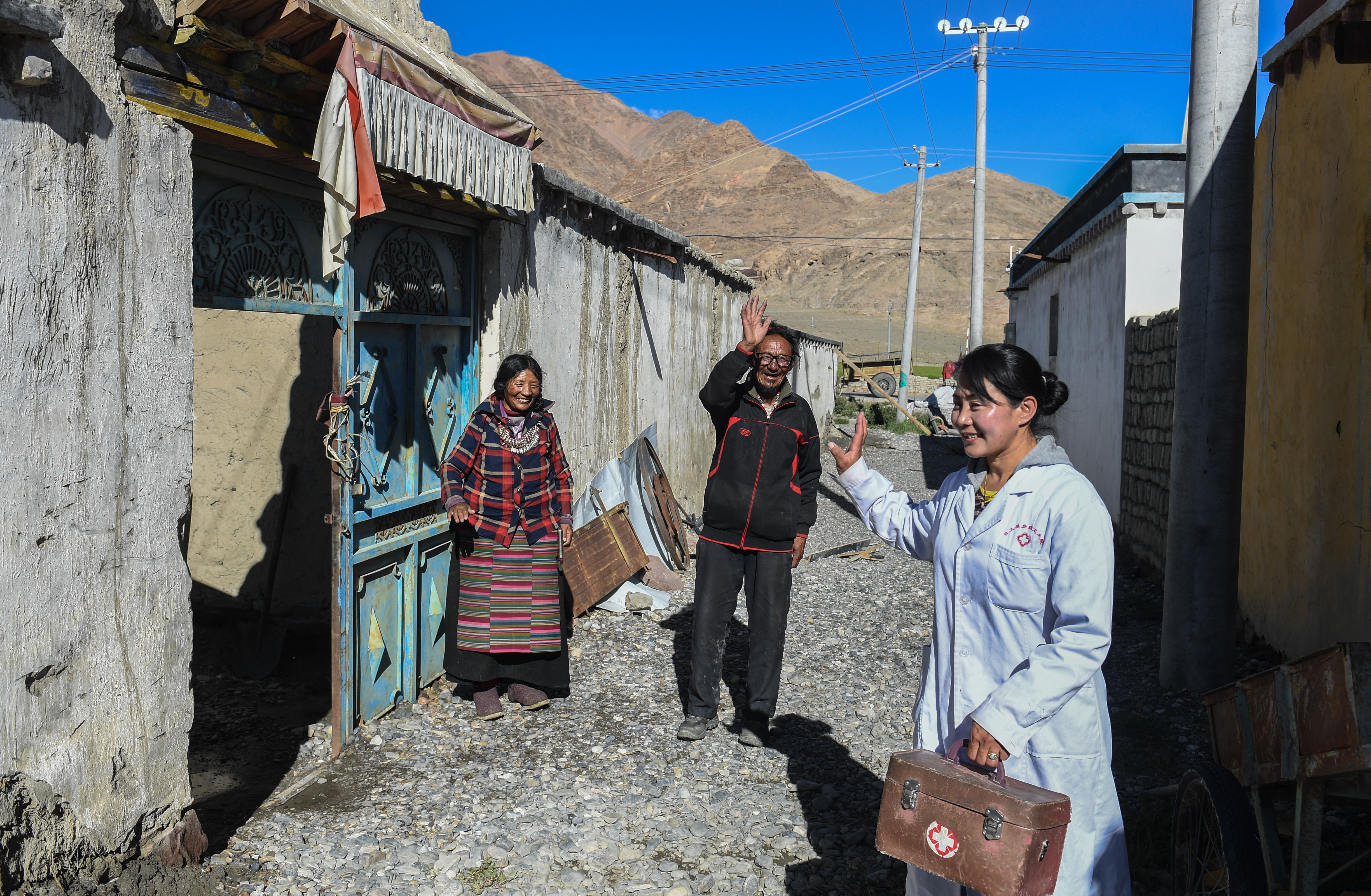 Zhoima (R) conducts a medical checkup for a villager at the health room in Wuqang Village, SW China's Tibet Autonomous Region, Aug. 3, 2019. (Xinhua/Jigme Dorje)