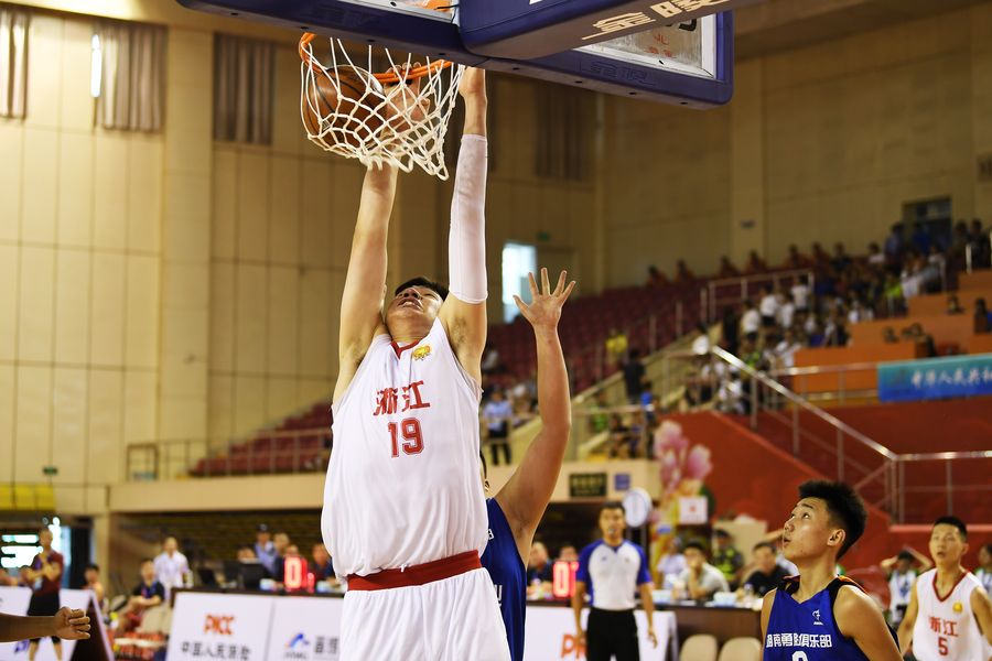 Yu Jiahao (L) of Zhejiang Chouzhou dunks during the match against Hunan Yongsheng at the 2nd China Youth Games in Taiyuan, northwest China's Shanxi Province, on August 1, 2019. Zhejiang won 92-58. (Xinhua/Yang Chenguang)