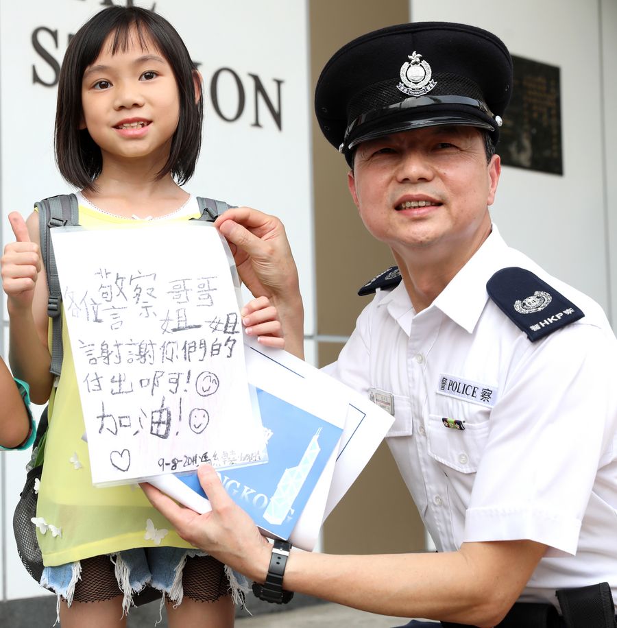 A child visits Central Police Station to express her support for the police force in Hong Kong, south China, Aug. 10, 2019. (Xinhua/Wu Xiaochu)